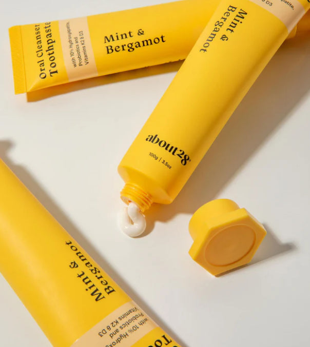 Sorbitol, Calcium Carbonate, Aqua, Hydroxypatite (nano), Organic Glycerin, Xylitol, Silica, Mentha Arvensis (Wild Mint) Leaf Oil, Sodium Lauroyl Sarcosinate (derived from coconut), Stevia, Potassium Sorbate, Xanthan Gum, Citrus Bergamia (Bergamot) Peel Oil, Menaquinone-7 (Vitamin K2), Caprylic/Capric Triglyceride (from MCT oil), Cholecalciferol (Vitamin D3), Tocopherol, Lactobacillus Reuteri.